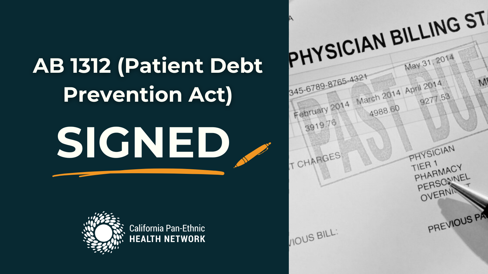 On Tuesday, October 7th, Governor Newsom signed AB 1312, the Patient Debt Prevention Act. This landmark bill will protect patients and families from crushing medical debt after hospital stays, ensuring they are able to access existing hospital financial assistance programs rather than facing debt collectors for bills they shouldn’t owe. Authored by Asm. Pilar Schiavo (D-Chatsworth), the bill was backed by a coalition of health care consumer and health equity advocates including the California Pan-Ethnic Health Network (CPEHN), Health Access California, Leukemia and Lymphoma Society, and Rising Communities.